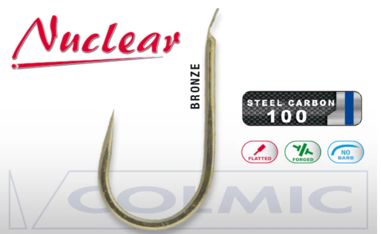 Amo bronzato, senza ardiglione (barbless) in acciaio al carbonio con punta affilata chimicamente.