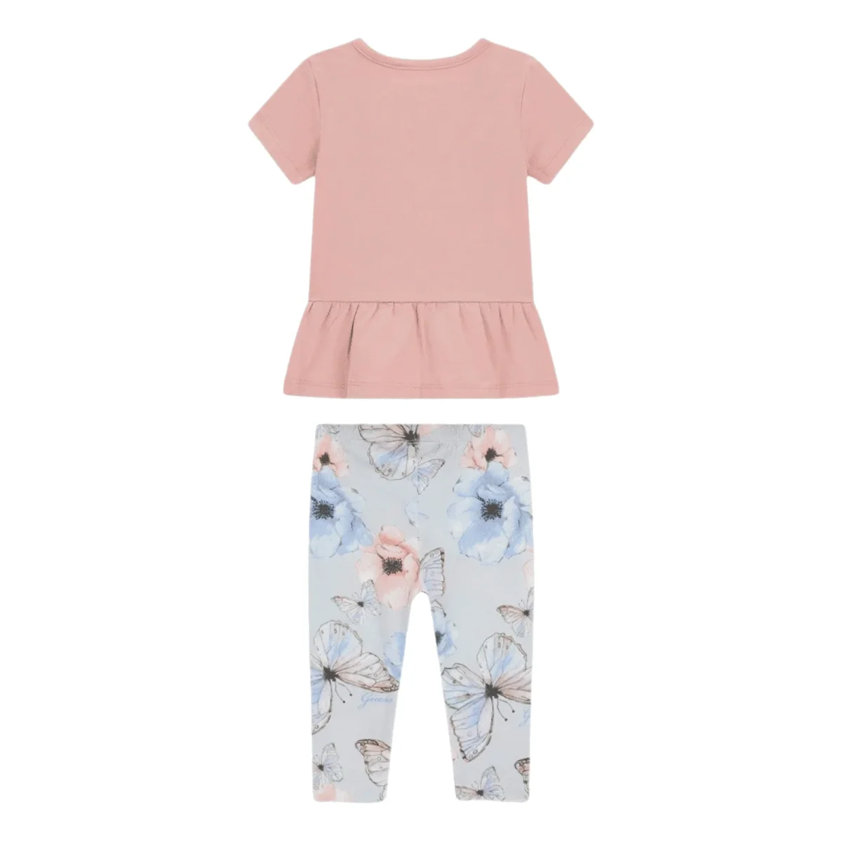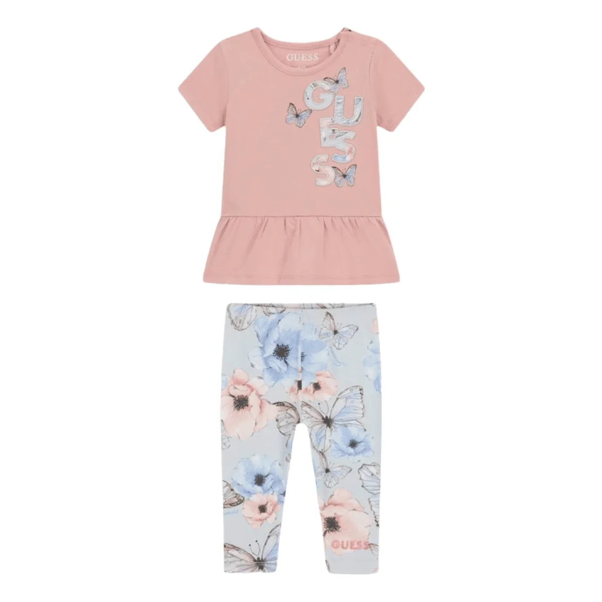 Il Completo neonata di GUESS è pensato per offrire stile e comfort alle più piccole. Realizzato in cotone organico elasticizzato, include una t-shirt a mezza manica arricchita da una balza in vita e un delicato ricamo in tessuto. I leggings fantasia completano il look, garantendo libertà di movimento e un tocco di allegria per ogni occasione.