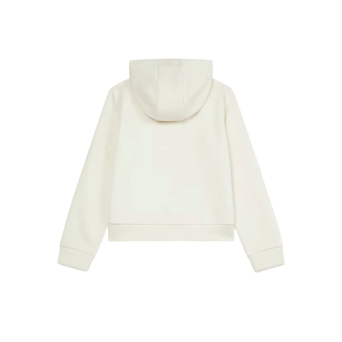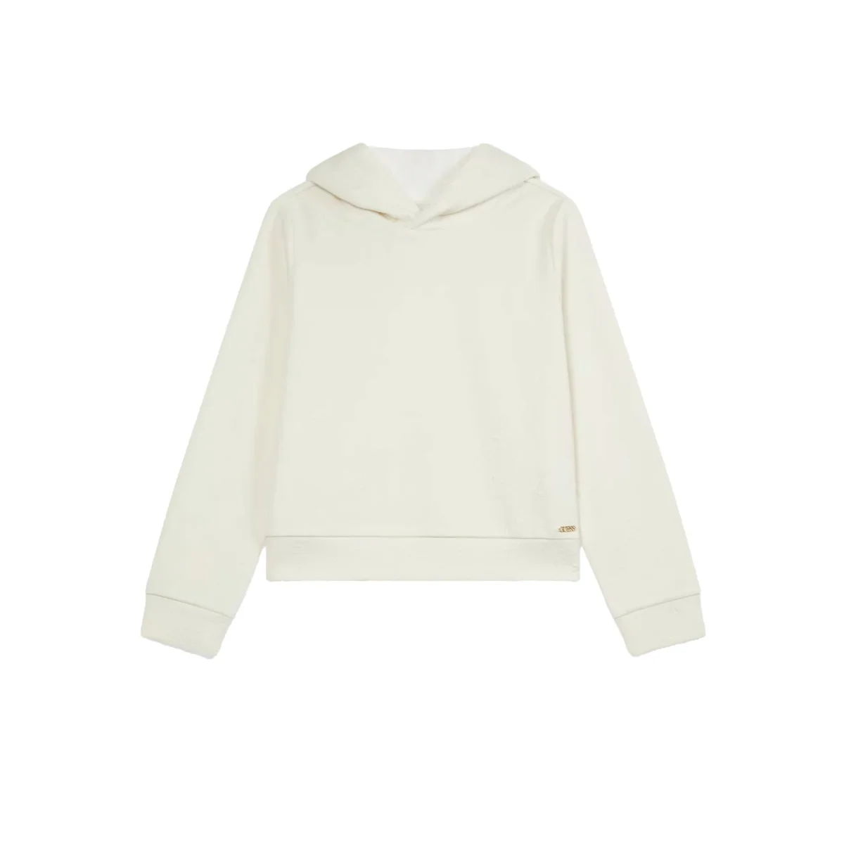 Felpa bambina dal design moderno e confortevole, ideale per il tempo libero firmata Guess. Il modello è dotato di un comodo cappuccio, maniche lunghe e orlo e polsi elasticizzati che assicurano una vestibilità pratica e avvolgente. Il look è caratterizzato dal logo all over sur ton, completato da un elegante logo in metallo dorato applicato al fondo che aggiunge un tocco distintivo
