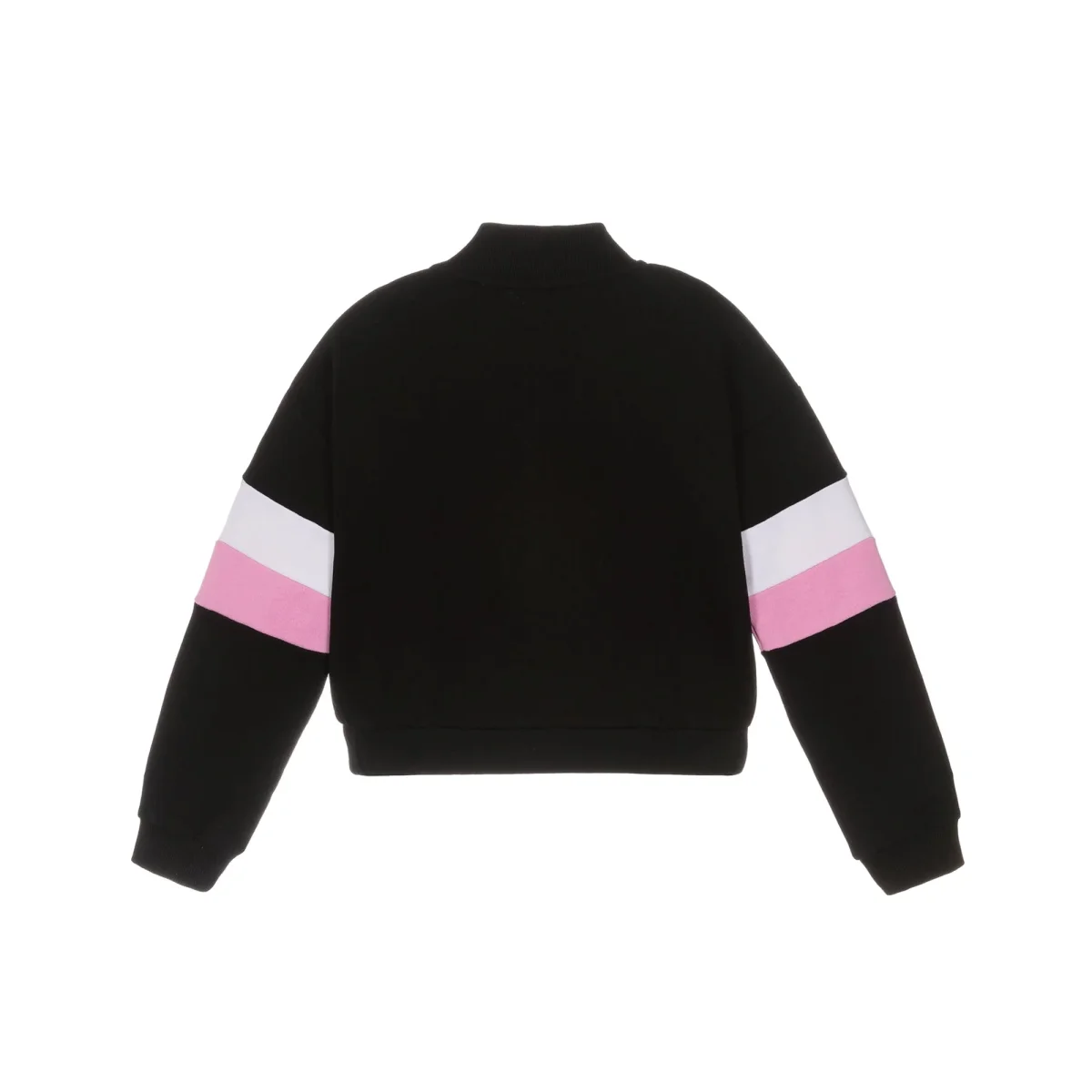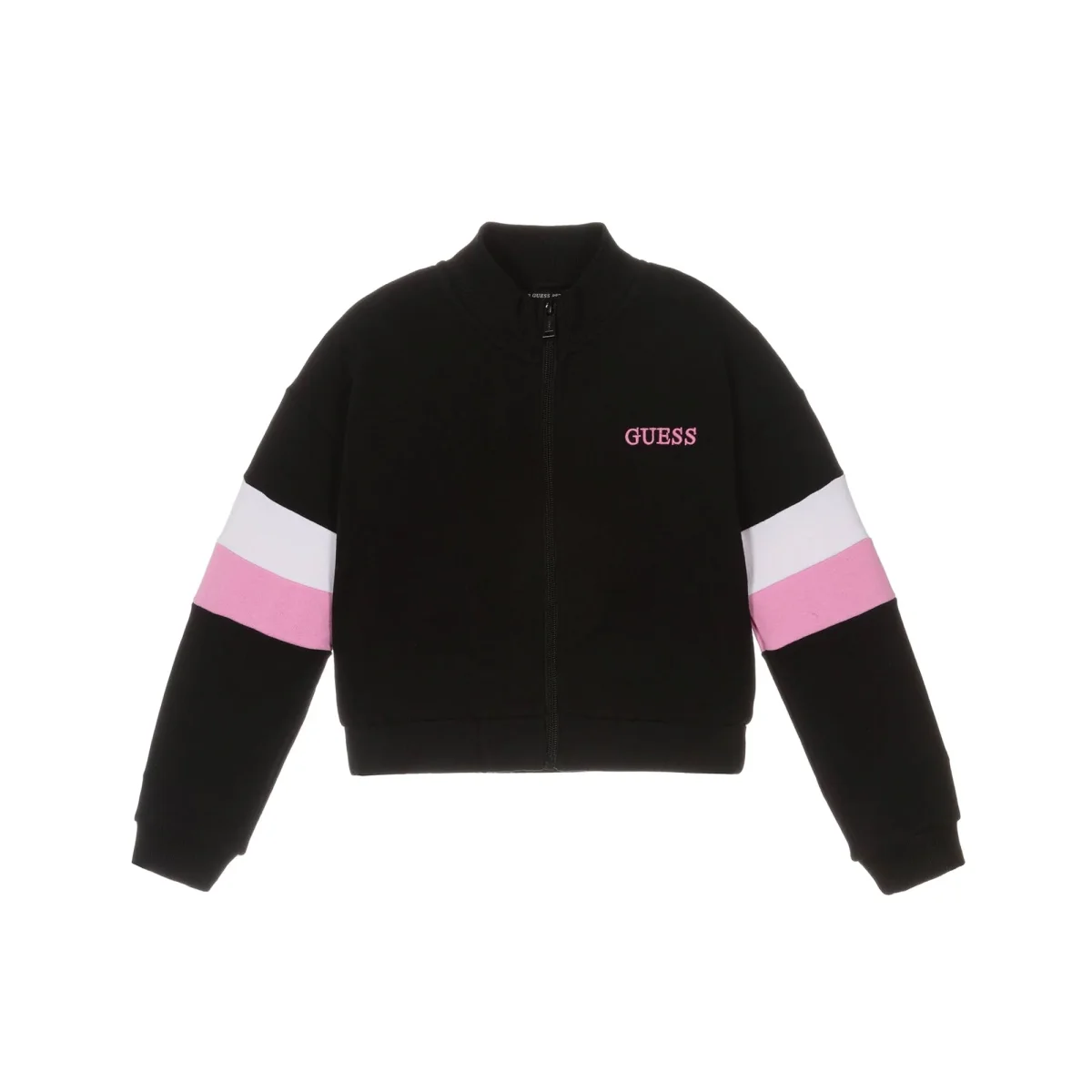 Felpa bambina dallo stile sportivo e confortevole firmata Guess, perfetta per il tempo libero e le attività quotidiane. Il modello presenta una pratica chiusura con zip frontale, maniche lunghe e orlo e polsi elasticizzati per una vestibilità comoda. Il design è arricchito da un logo rosa ricamato sul petto e da righe rosa e bianche lungo le maniche, che donano un tocco vivace e dinamico.