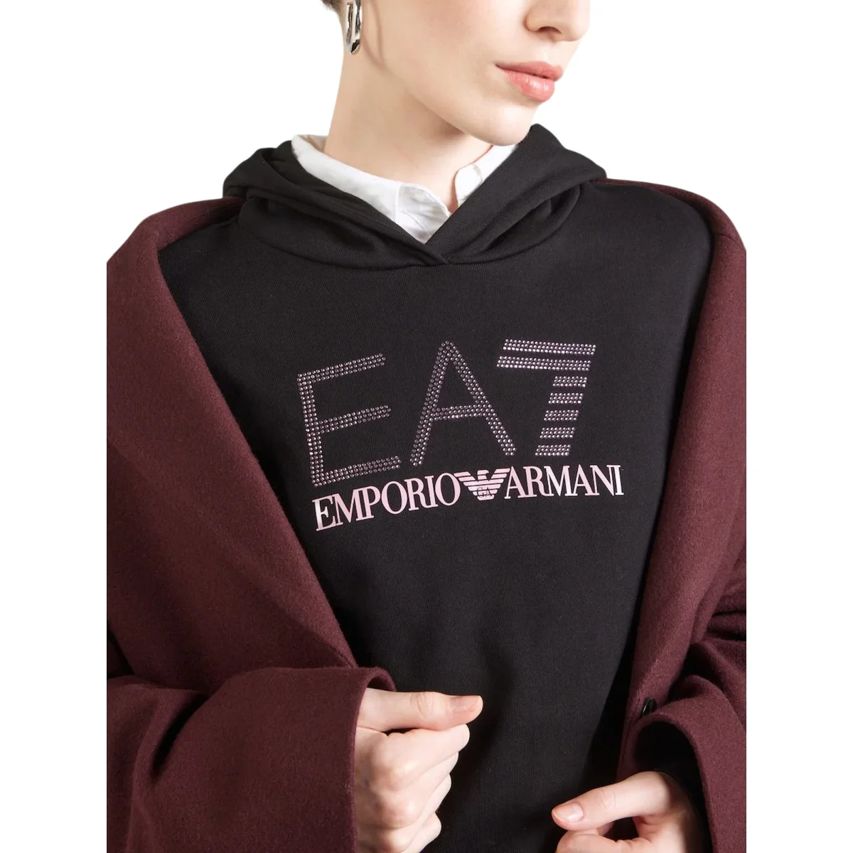 Scopri la Felpa nera donna firmata Emporio Armani che unisce stile e comfort. Caratterizzata da un cappuccio accogliente, tasche a marsupio pratiche e un taglio dritto che valorizza la silhouette. I dettagli raffinati includono orlo e polsi a coste per una vestibilità perfetta, mentre il maxi logo con strass sul petto cattura l’attenzione con un tocco di eleganza scintillante. Completata da un piccolo logo stampato, questa felpa tinta unita è l’essenziale versatile che non può mancare nel tuo guardaroba.