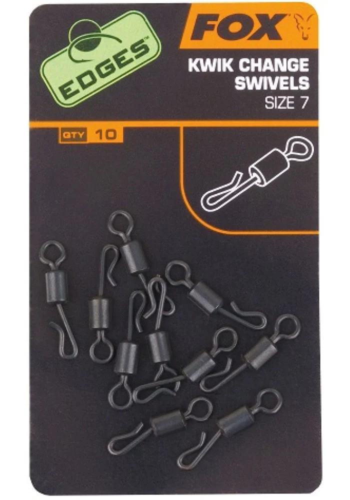 EDGES KWIK CHANGE SWIVELS è una girella a sancio rapido per i terminali.La nuova gamma EDGES™ è realizzata da una serie di prodotti per la produzione di terminali, ognuno dei quali, individualmente, è stato progettato per rendere le tue montature migliori di quanto lo siano mai state finora. All’interno della gamma troverete leaders, filati per terminali, clip, manicotti, guaine termorestringenti e “segreti” (trucchi), progettati in collaborazione con il consulente e subacqueo Rob Hughes, in modo che i loro colori ed il miglior aspetto si fondano per realizzare tutta una serie di prodotti con un massiccio “egde” in se stessi.. Le girelle Kwik Change Swivels, in abbinamento ai manicotti Anti Tangle Sleeves, consentono all’angler di sostituire istantaneamente un rig o collegare un sacchetto in PVA.