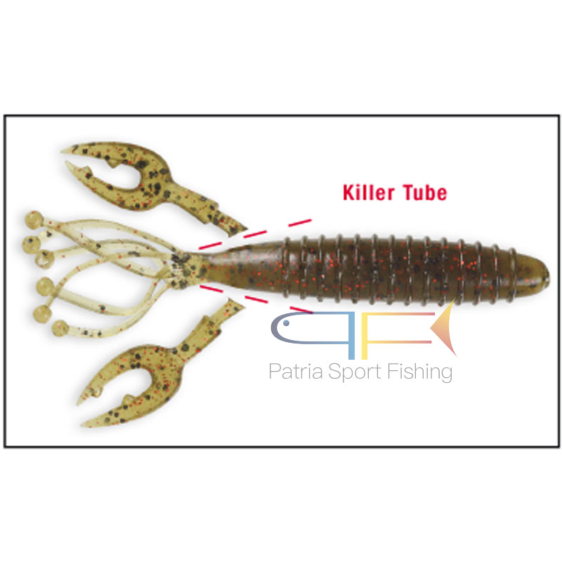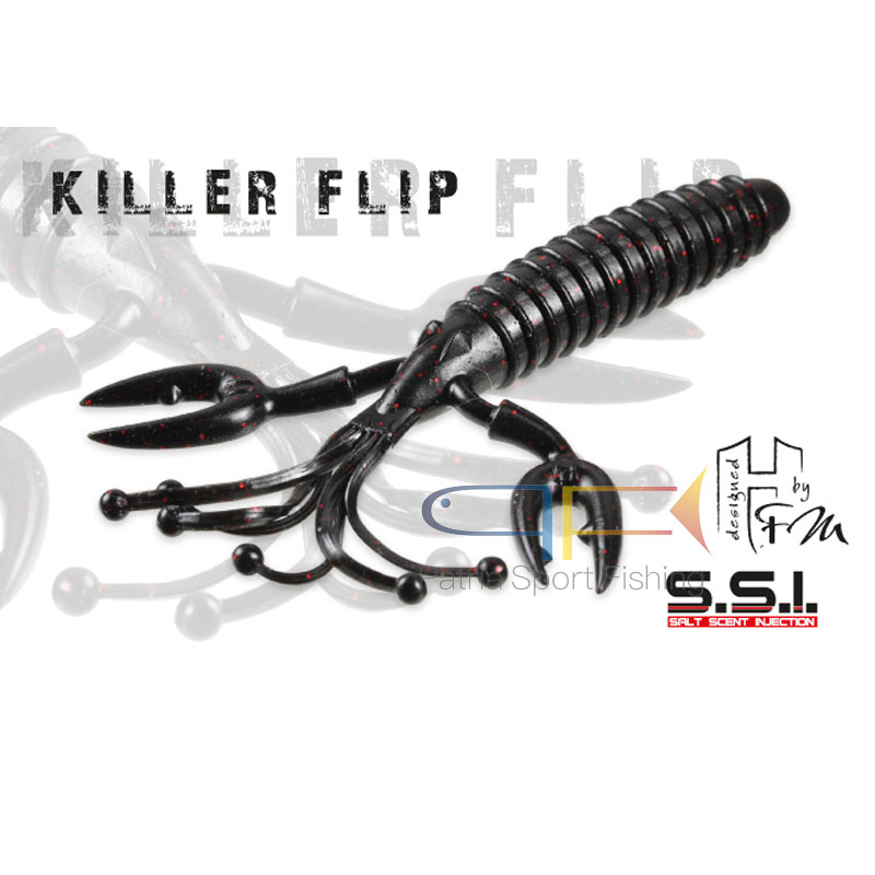 L’esca da flipping, pitching e skipping, ma anche da texas rig e da Sauteki rig. Si tratta di un corpo pesante ed allungato dotato chele. La testa del gambero è dotata di antenne alla cui estremità sono fissate sfere che durante il movimento producono vibrazioni. Il corpo ha una forma idrodinamica ed il suo peso facilita i lanci precisi tipici del pitching anche con esca spiombata. Per pescare a flipping queste caratteristiche sono altrettanto importanti per entrare nella cover facilmente. Per skippare l’esca è perfetta, ma volendo è possibile staccare le due braccia dotate di chele. Il risultato è un corpo fusiforme dotato di 6 filamenti che terminano con una sfera, in caduta sarà veramente catturante. Per capire l’efficacia del Killer Flip provate a lanciarlo in prossimità di un ostacolo senza muoverlo, vedrete che le estremità scenderanno vibrando lentamente, quindi immaginate il risultato se c’è un predatore nelle vicinanze.