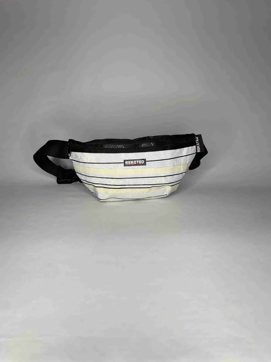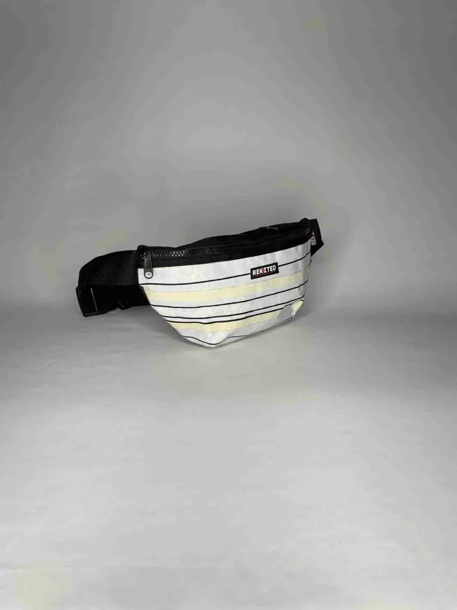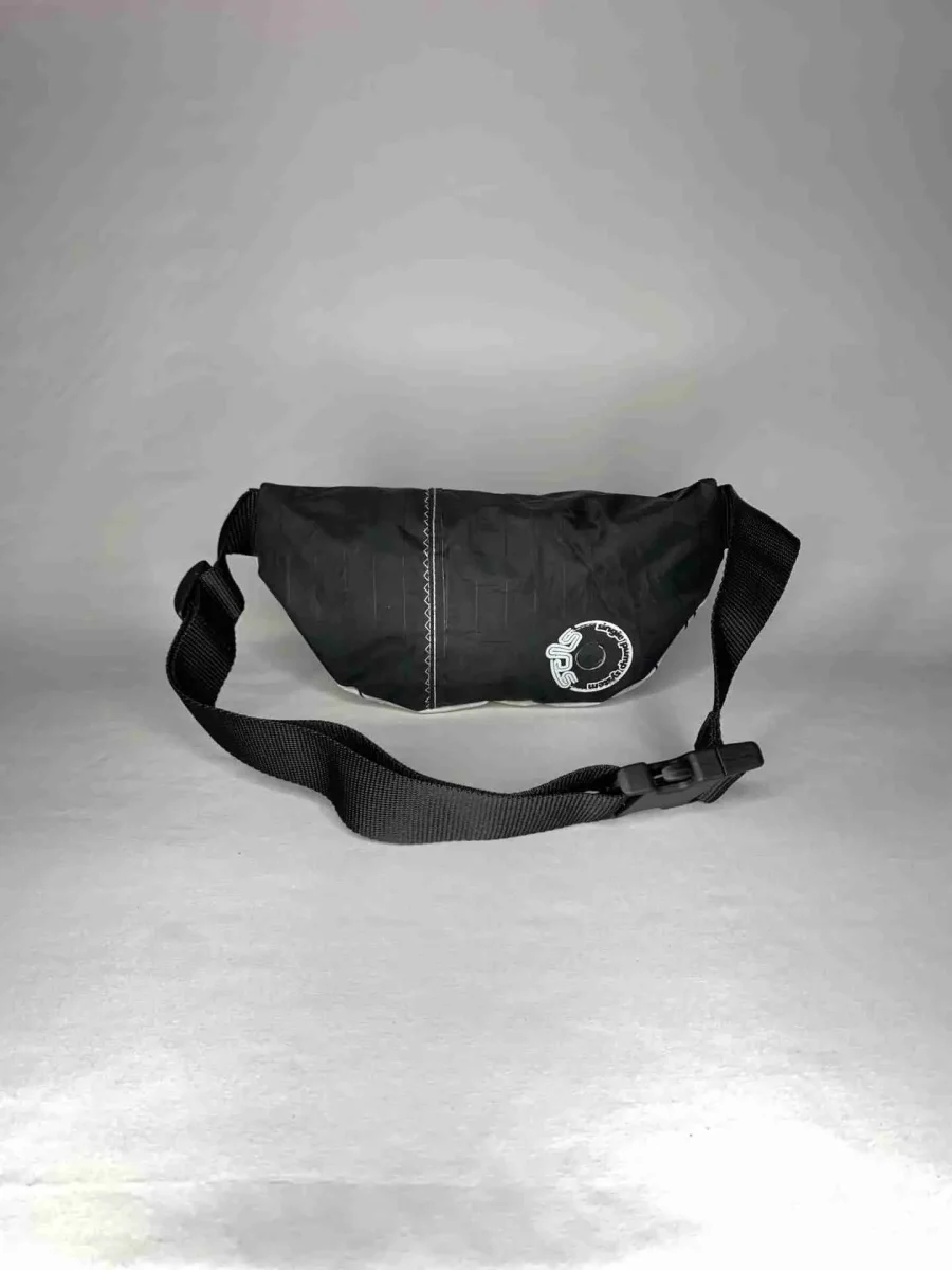 Realizzato artigianalmente in vela da kite riciclata, HARNESS è idrorepellente, resistente e unico: ogni pezzo conserva le caratteristiche originali della vela, come valvole, patch di riparazione, agganci per le linee e dettagli grafici, rendendo ogni marsupio diverso dagli altri.