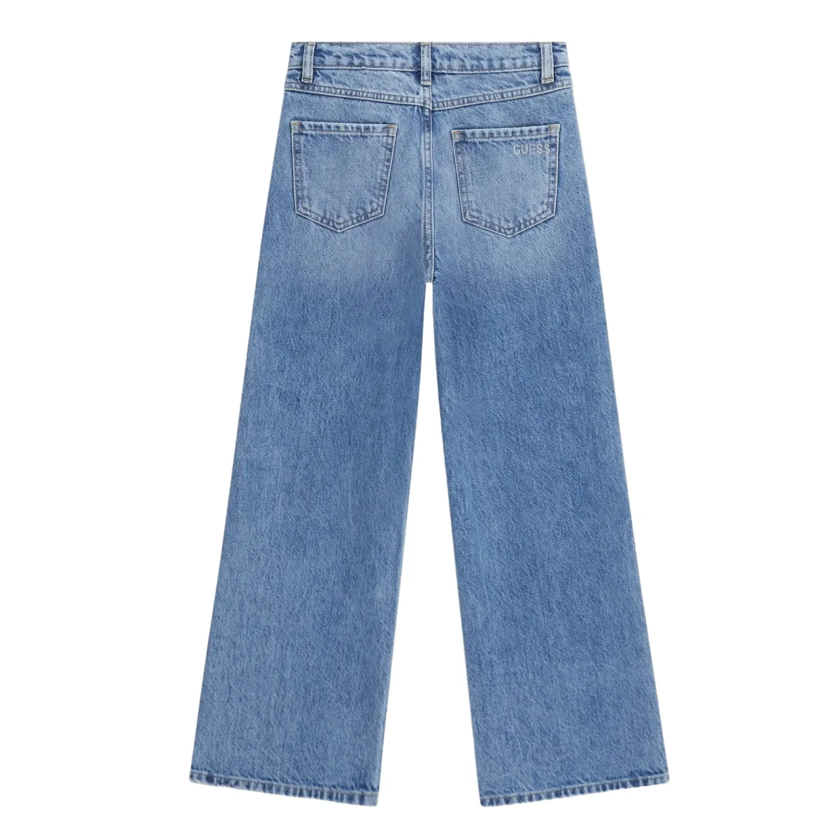 Jeans da bambina a gamba larga di Guess, dal design moderno e trendy. Il modello presenta chiusura con bottone e zip, tasche laterali e due tasche a filo sul retro per funzionalità e stile. I lievi strappi lungo la gamba conferiscono un effetto casual e contemporaneo, mentre il logo con strass applicato sulla tasca posteriore aggiunge un dettaglio luminoso e distintivo.