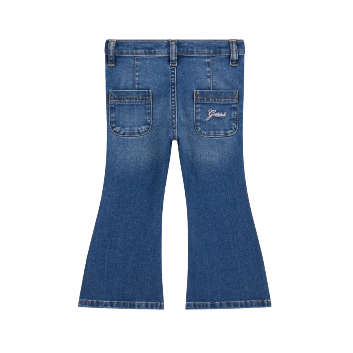 Jeans da bambina in denim con gamba a zampa, svasata al fondo, di Guess che dona al capo uno stile moderno e femminile. Il modello presenta chiusura con bottone e zip, due tasche frontali e due tasche sul retro. Il design è completato dal logo ricamato sulla tasca posteriore, dettaglio distintivo del brand.