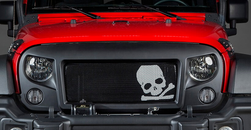 Mascherina Jeep Wrangler JK. Versione aggressiva Skull. Di facile e veloce installazione, compatibile con tutte le versioni JK e JKU.