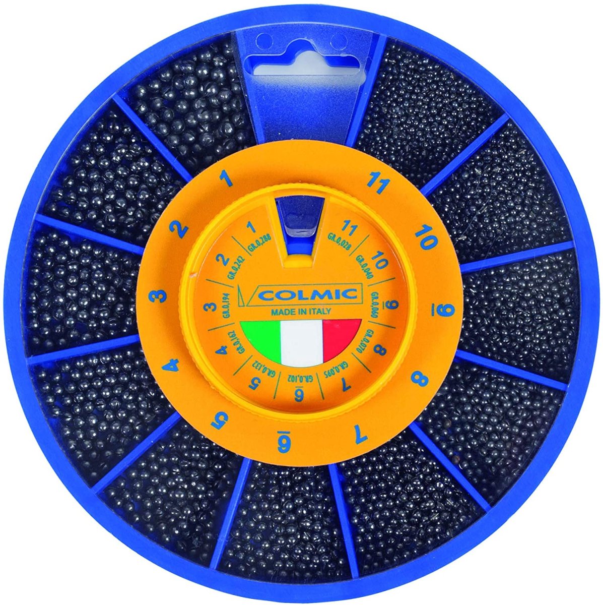 Pallini di piombo super selezionato. taglio perfettamente centrato. di media durezza non intacca il nylon della lenza durante lo scorrimento. scatola da 11 scomparti
