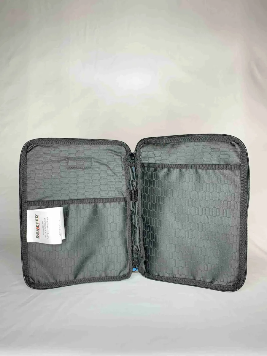 Al suo interno ci sono2 tasche in fodera per portare il tablet, il carica batterie, cavetti vari e un porta penna.