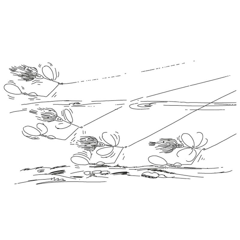 Lo spinnerbait classico è una struttura in filo metallico, con una o più palette su girella o cavalierino nella parte superiore e montato con piombo, amo e skirt nella parte inferiore. Herakles ha voluto rivoluzionare questa situazione: la struttura in filo metallico resta, ma viene aggiunta una testa in ABS nella parte superiore a cui vengono fissati amo e skirt. Nella parte inferiore resta il piombo cui è fissata una paletta tramite split ring e girella. Inoltre, una seconda paletta montata su cavalierino gira intorno al proprio asse nella parte superiore. Il motivo di questa “mutazione” è la voglia di creare uno spinnerbait da recuperare a stretto contatto con il fondo su flat e sassaie, luoghi in cui un amo sulla parte inferiore può essere d’impiccio, o non perfettamente efficace al momento dell’abboccata. Il risultato è uno spinnerbait molto catturante che produce una quantità impressionate di vibrazioni ottimo da usare a slow rolling e non solo. Ideale per Black Bass.