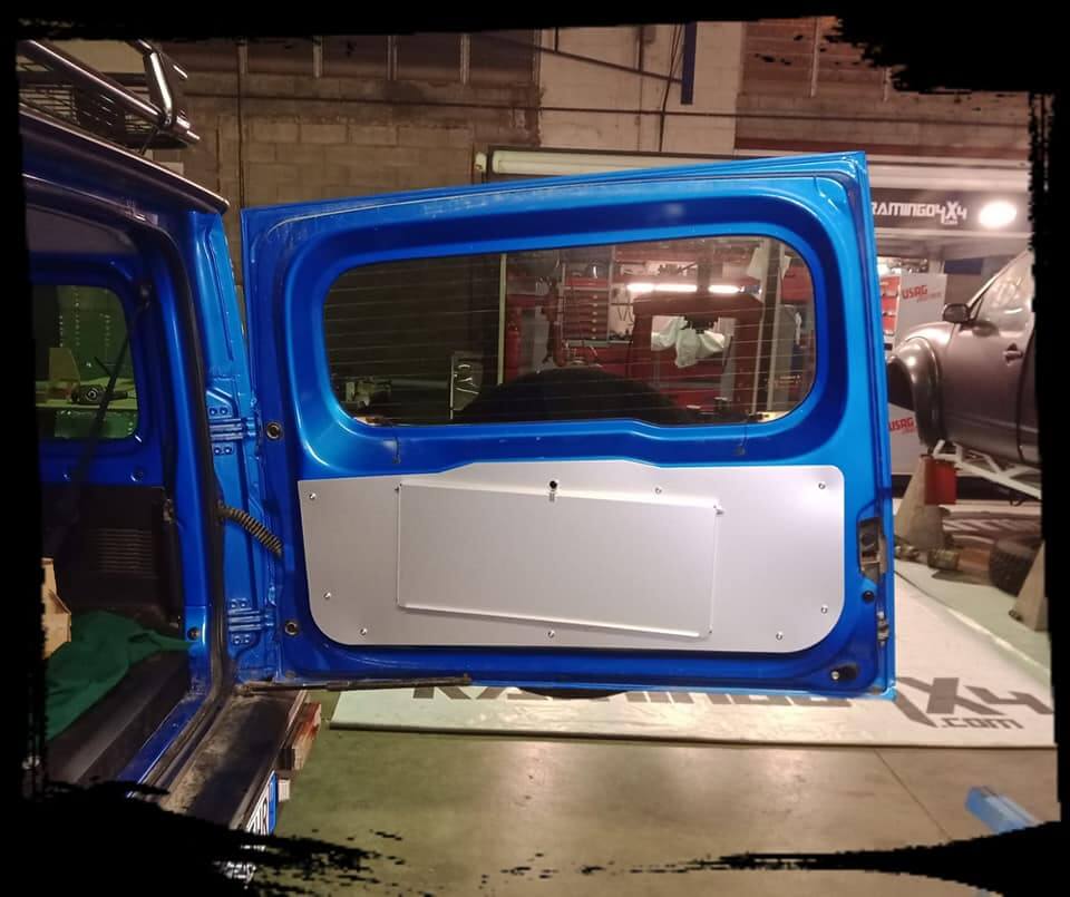 Kit pannello portellone posteriore + tavolino in alluminio anodizzato specifico per Suzuki Jimny dal 2018.