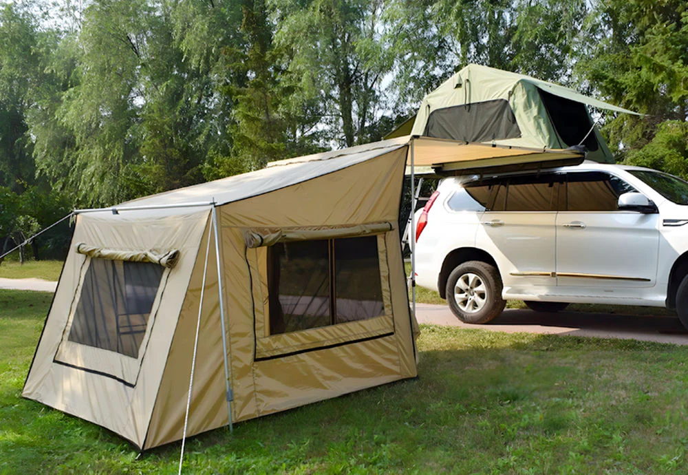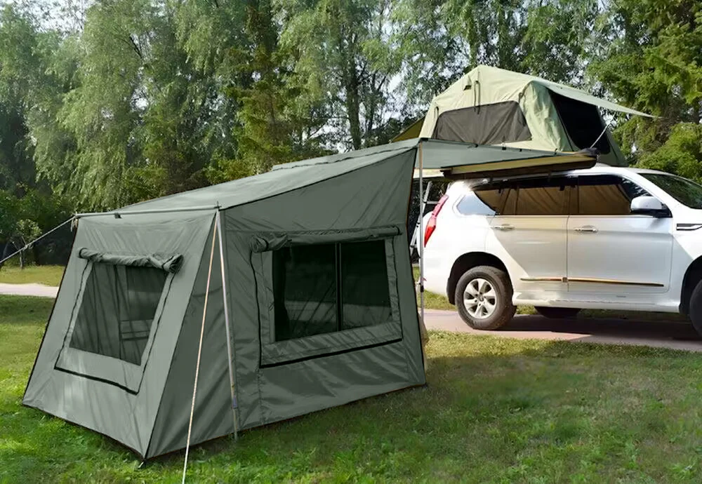 La nostra spaziosa tenda OutdoorU porta una dose extra di comfort alla vostra avventura in campeggio. Offre spazio aggiuntivo per riporre e vivere e rende sopportabili le giornate di pioggia. Anche la praticità e la stabilità sono le priorità assolute: per questo la struttura e i materiali sono stati scelti in modo che possa stare in piedi da sola e possa essere utilizzata in modo completamente indipendente dall’auto. In altre parole, non deve essere trasformata o smontata se si vuole partire in auto. Se vi piace particolarmente accogliente, potete anche collegarla alla tenda da sole e guadagnare ancora più spazio.