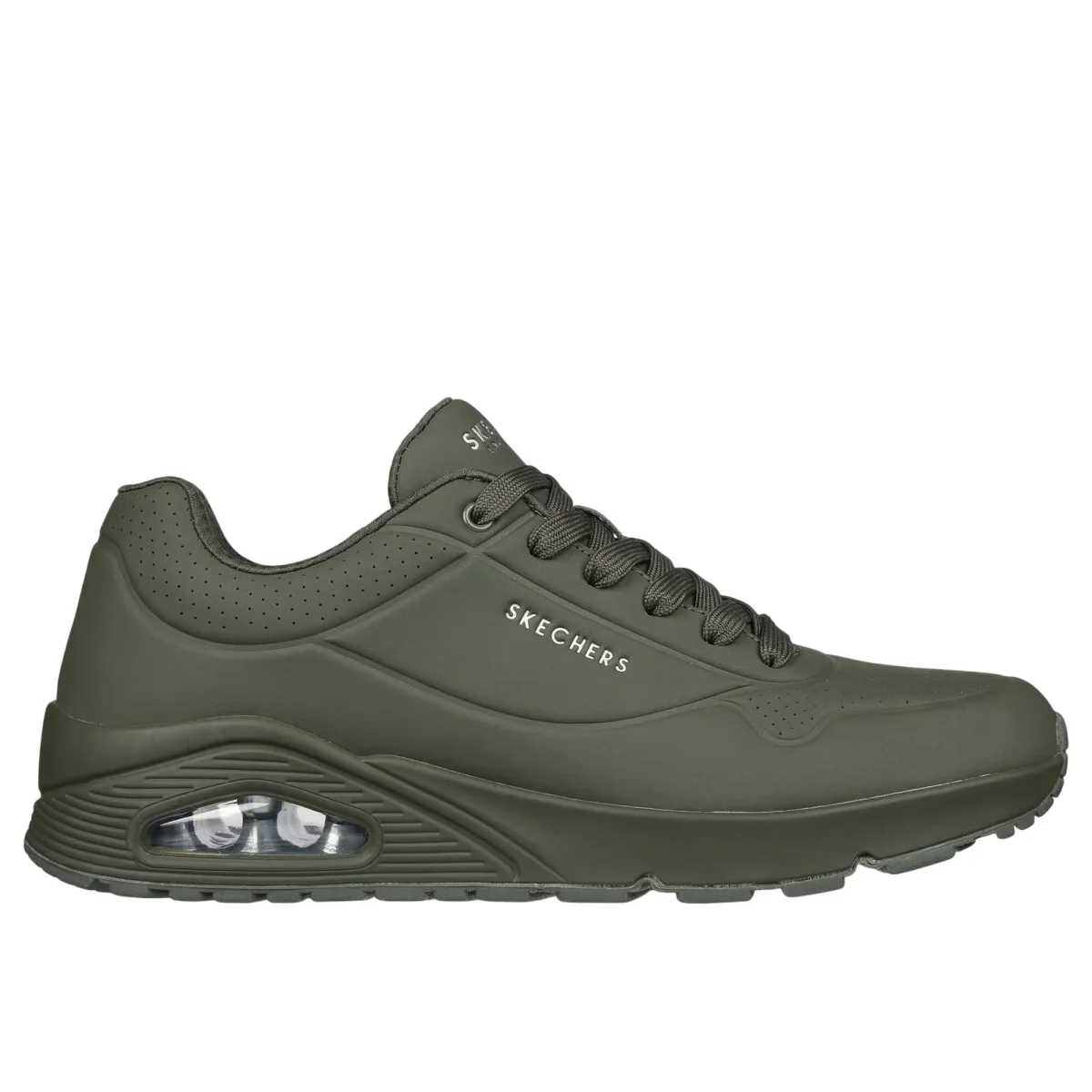 Lo stile classico con imbottitura ad aria viene rivisitato nella scarpa Skechers Street™ Uno – Stand on Air. Questo modello stringato di tendenza presenta una tomaia sintetica traforata liscia con soletta Air Cooled Memory Foam® e intersuola ammortizzata ad aria con tecnologia visibile Skech-Air®.