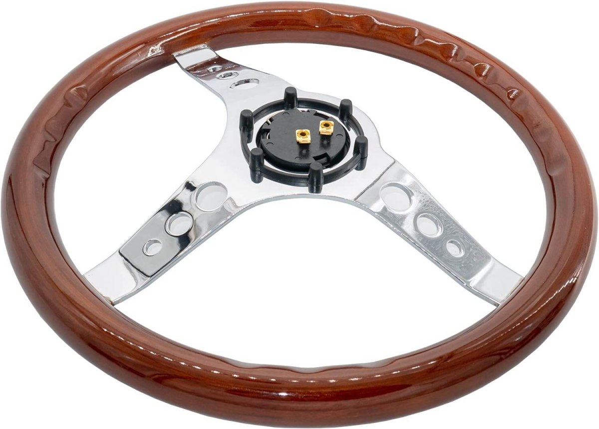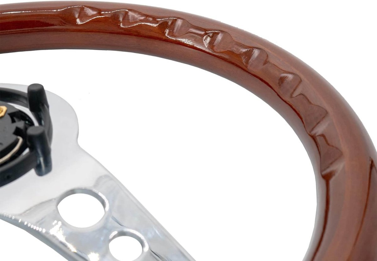 Volante piatto in vero legno con razze cromate, completo di pulsante clacson centrale.