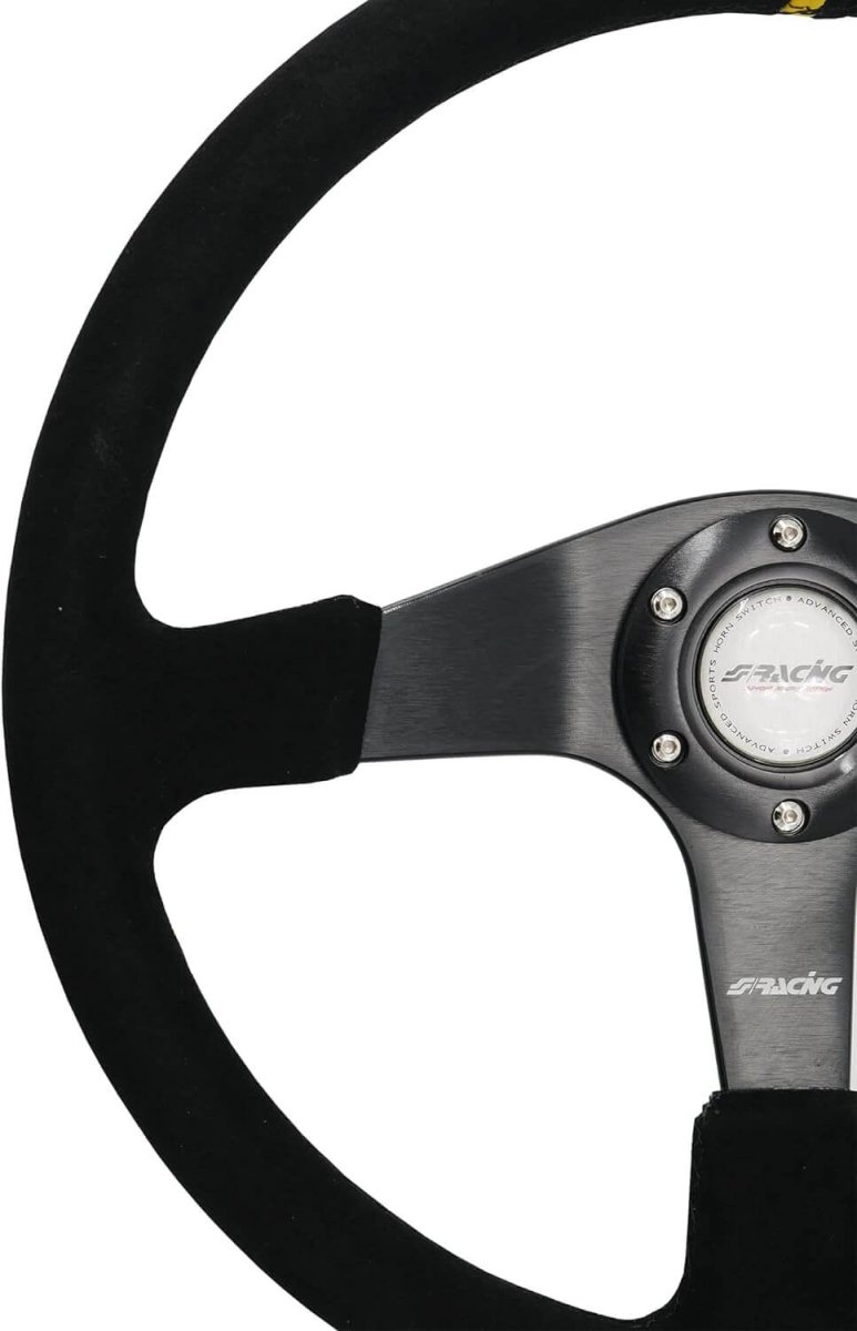 Volante piatto in pelle nera scamosciata diametro 38 cm. Completo di pulsante clacson centrale.