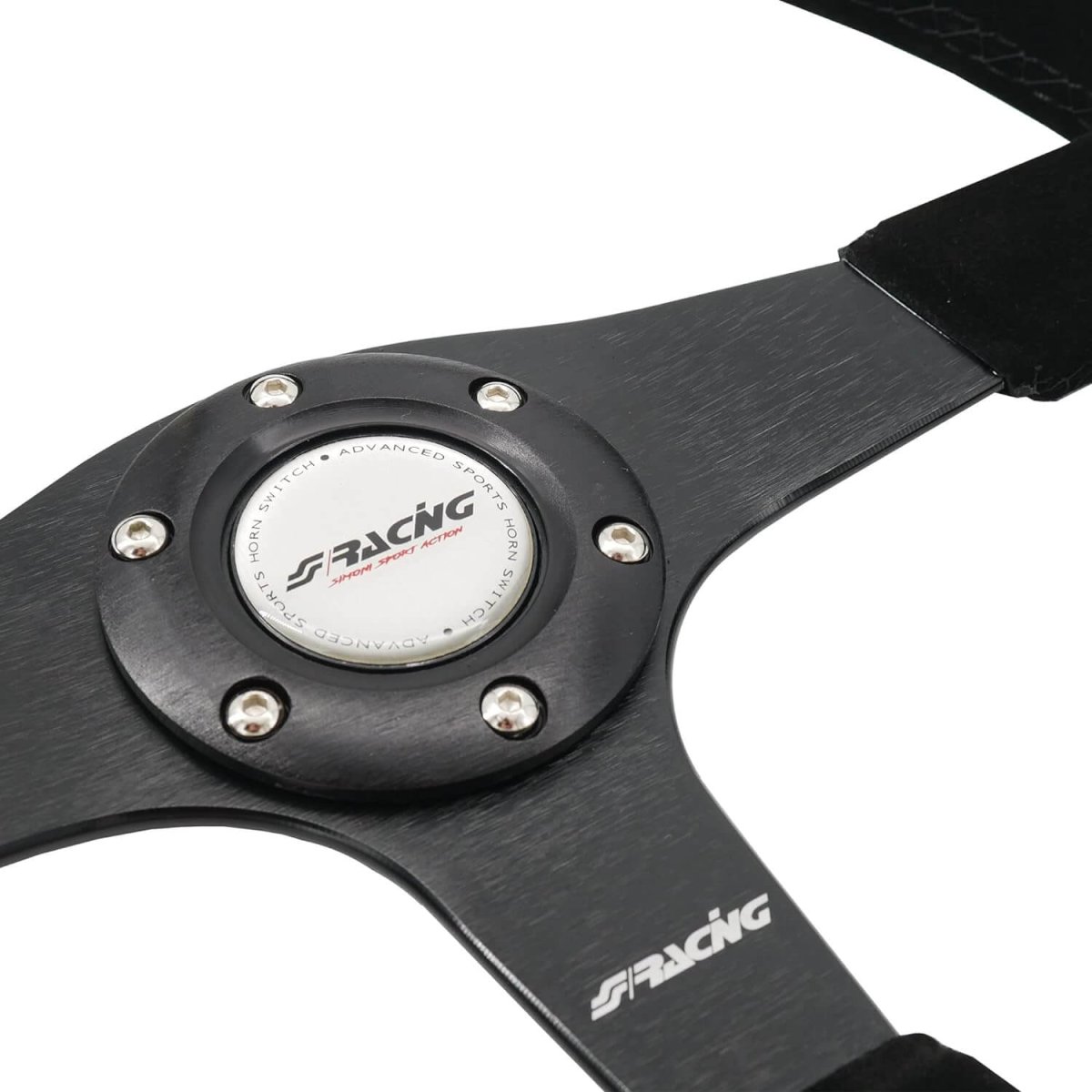Volante a calice in pelle nera scamosciata, completo di pulsante clacson centrale.